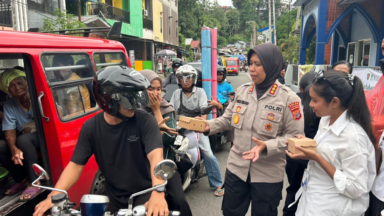 AMBONKITA.COM,– Kepolisian Daerah Maluku melalui Bidang Hubungan Masyarakat (Bid Humas) dan Bidang Profesi dan Pengamanan (Bid Propam) membagikan ratusan paket takjil Ramadan kepada masyarakat pengguna jalan di Kota Ambon, Selasa (10/3/2026).