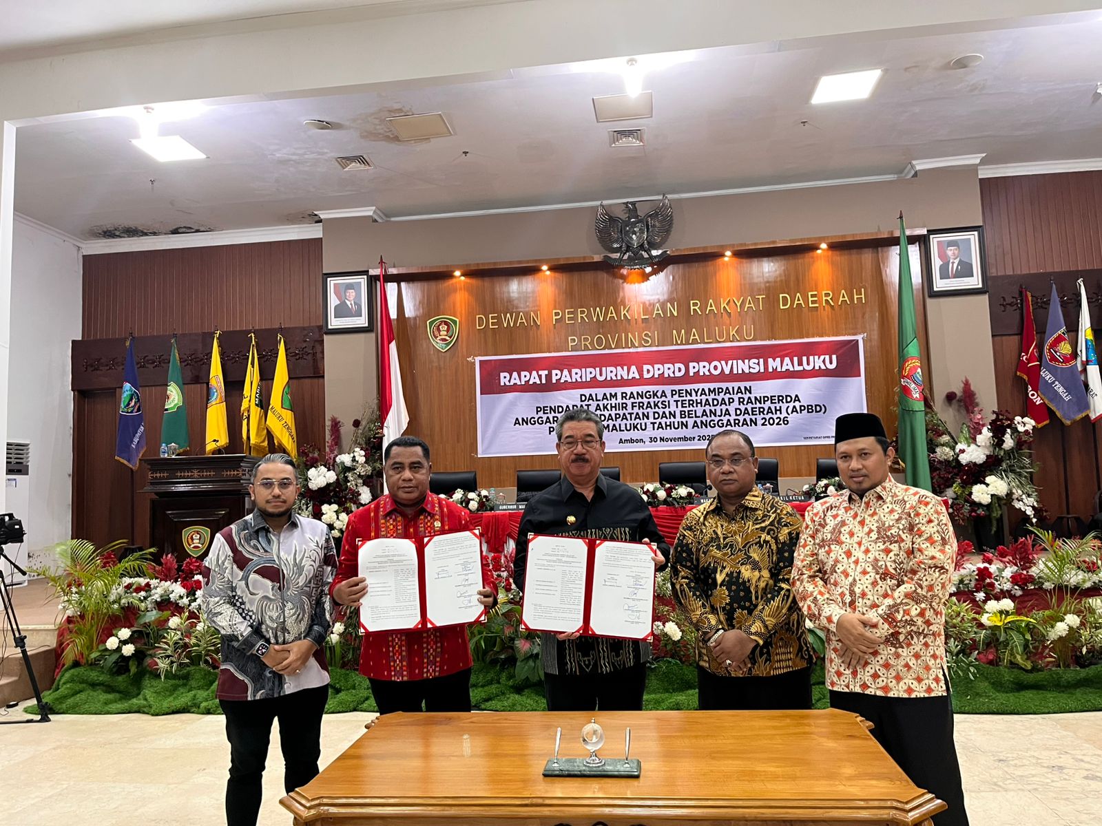 Ranperda APBD 2026 ditetapkan melalui Rapat Paripurna yang digelar di ruang sidang utama gedung DPRD Provinsi Maluku, Karang Panjang, Kota Ambon, Minggu (30/11/2025).
