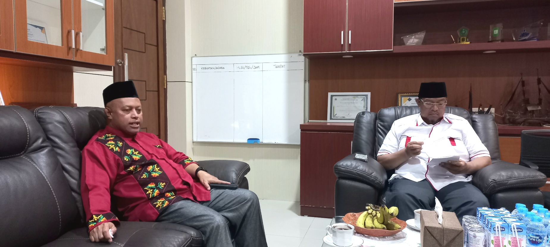 Ketua Panitia Penyelenggara Ibadah Haji Provinsi Maluku, Dr. Djalaludin Salampessy (kiri) dan Kepala Kantor Wilayah Kementerian Agama Provinsi Maluku, Dr. H. Yamin (kanan) saat menyampaikan keterangan pers, Rabu (14/5/2025). (Foto: Husen Toisuta/AmbonKita.com)